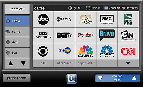 Our user interface also allows for a dedicated channel guide directly on your touchpanel. This guide can be updated remotely as channels are added or numbers are changed. When your cable provider adds new channels to their high-definition offerings, the icons appear under the HDTV section of your user interface automatically. You can also update your favorite channels directly on your touchpanel. Imagine there are three sporting events happening simultaneously, and you would like to keep an eye on all three. You can easily find the channels in the sports section of the guide, add these channels to your favorites, and quickly switch between the channels. We can even provide smaller TVs that flank your primary display. Now you can really watch everything simultaneously.